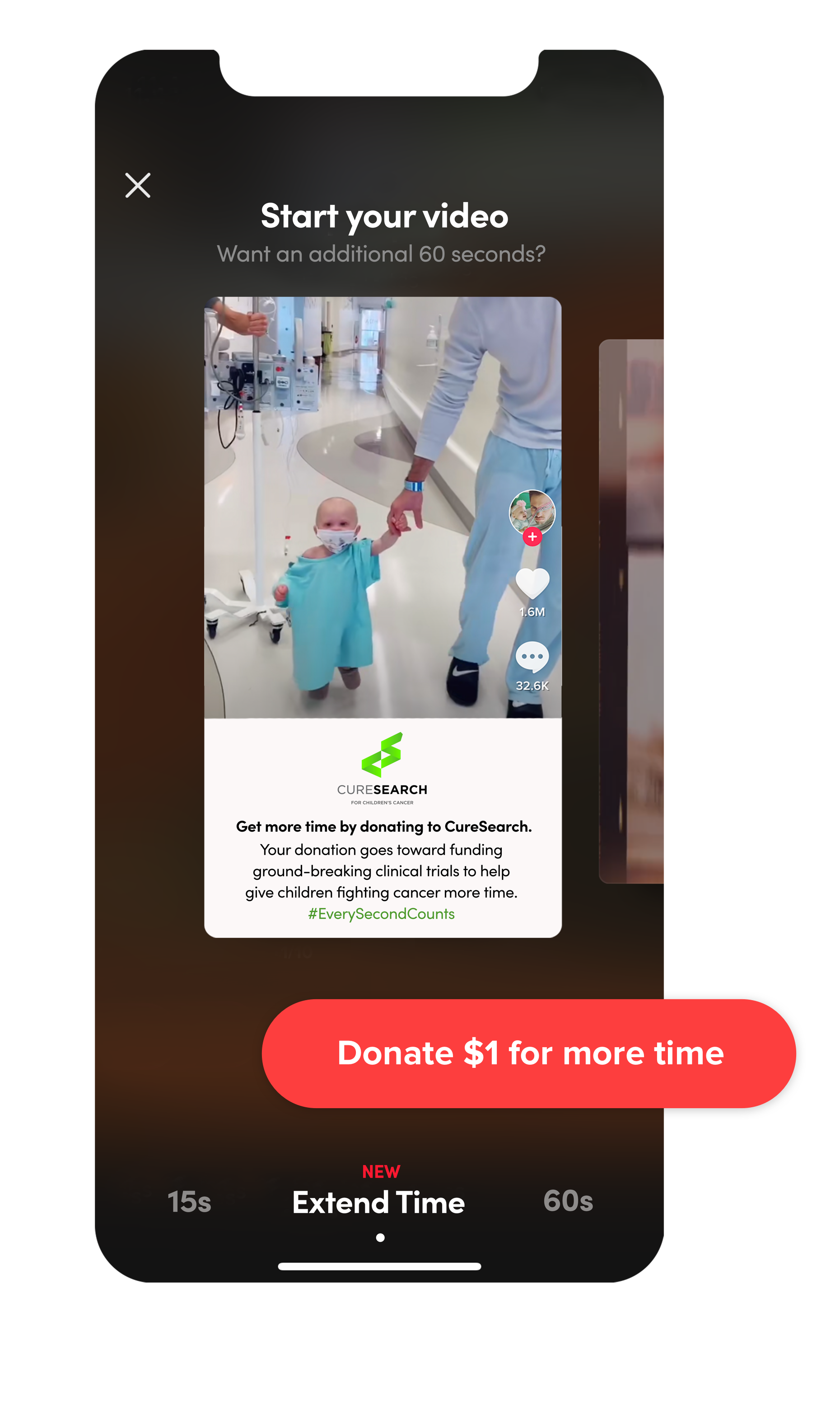 Introducing the #EverySecondCounts campaign – a corporate partnership between TikTok and CureSearch that changes the way the TikTok platform works to fund the cures to childhood cancer. For a small in-app donation, users can lengthen their video content time. We'll extend the maximum content length to two full minutes, more than doubling the usual upload, for a week after donation. Proceeds of the time extensions will go to CureSearch. We'll also extend our campaign by expanding on existing behaviors in TikTok: a custom campaign hashtag so users can "duet" and encouraging a new "Ring the Bell" dance. The dance children do when they finally beat their cancer.